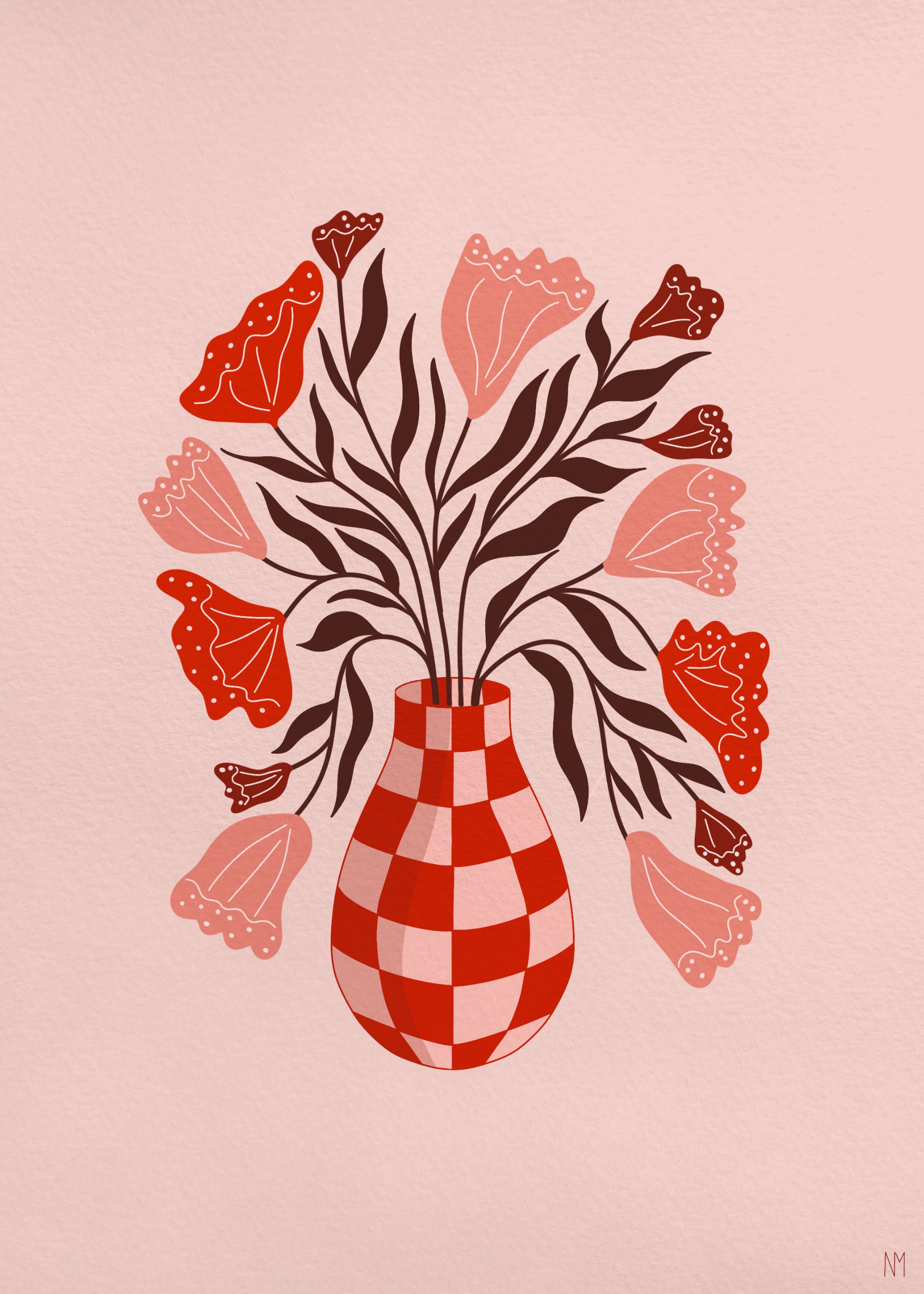 Flowers on minimalistinen ja surrealistinen taidejuliste, jossa geometrinen ruutukuosinen ruukku kohtaa abstraktisti kuvioidut kukat. Kaksiulotteinen toteutus ja punaisen sekä vaaleanpunaisen eri sävyt tekevät teoksesta rohkean ja modernin katseenvangitsijan.