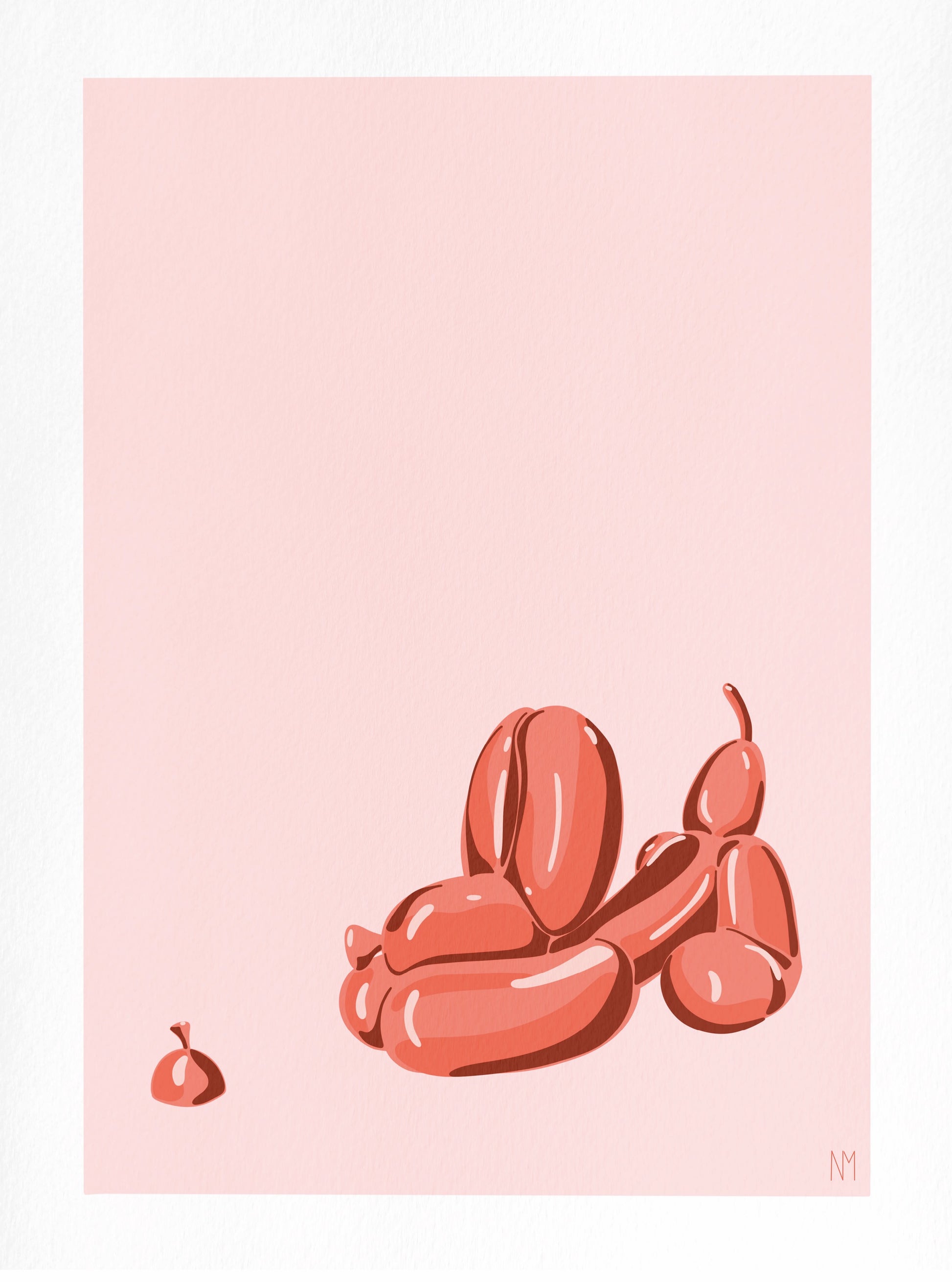 Leikkimässä on dopamine decor-tyylinen juliste, joka tihkuu iloa ja keveyttä. Teoksen pääosassa on vaaleanpunainen ilmapallokoira, joka tällä kertaa innostuu palloleikeistä. Kuva on sekä veikeä että visuaalisesti näyttävä, täydellinen yhdistelmä väriä ja huumoria.